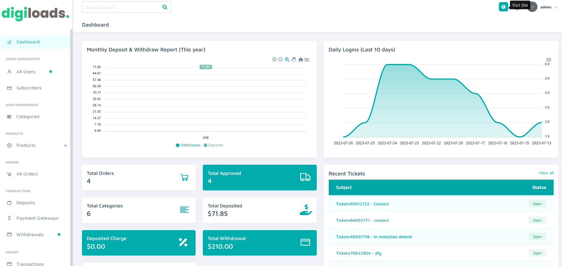 We have created very informative dashboards to work with. You'll be able to see a full overview of your system from this dashboard like how many users you've, how many deposits are made to your system and etc.